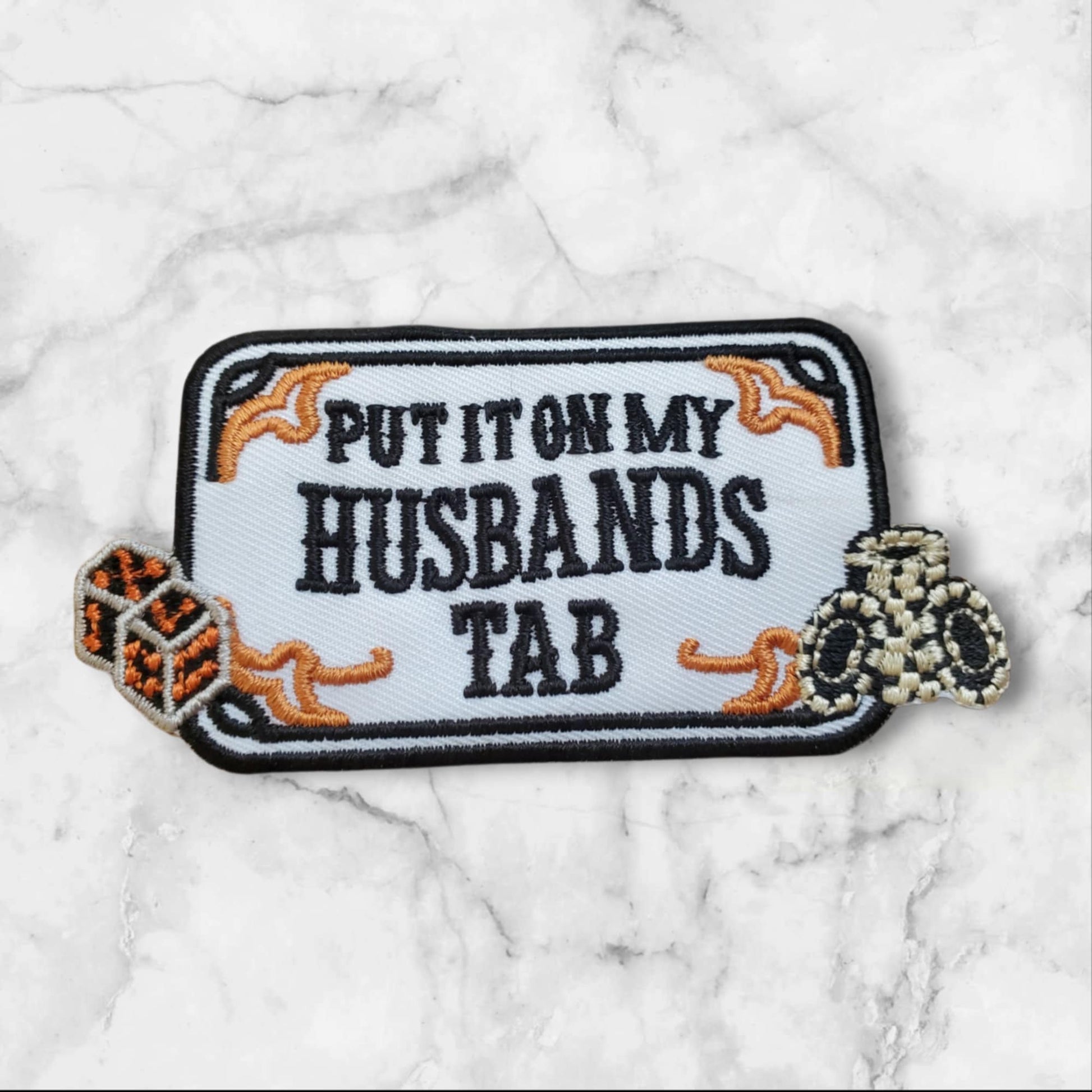 Roll the dice on style with this sassy "Put It On My Husband's Tab" patch featuring authentic casino elements! Unlike the ordinary versions you see everywhere, this unique design showcases detailed dice and colorful poker chips, making it the perfect accessory for casino trips, girls' nights in Vegas, or any time you want to show off your playful side with a gambling twist.