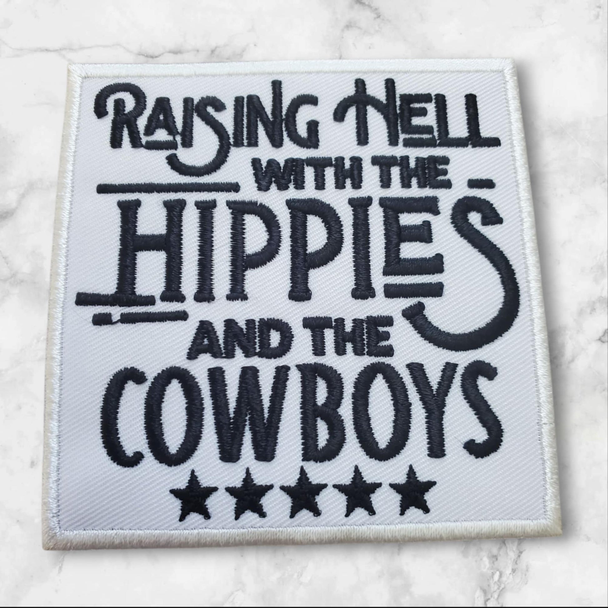 Inspired by the iconic country anthem, this "Raising Hell with the Hippies and the Cowboys" embroidered patch is bold, gritty, and full of southern soul. Featuring a clean white base with sharp black embroidery, it’s a classic color combo that pops on any hat, vest, jacket, or bag.