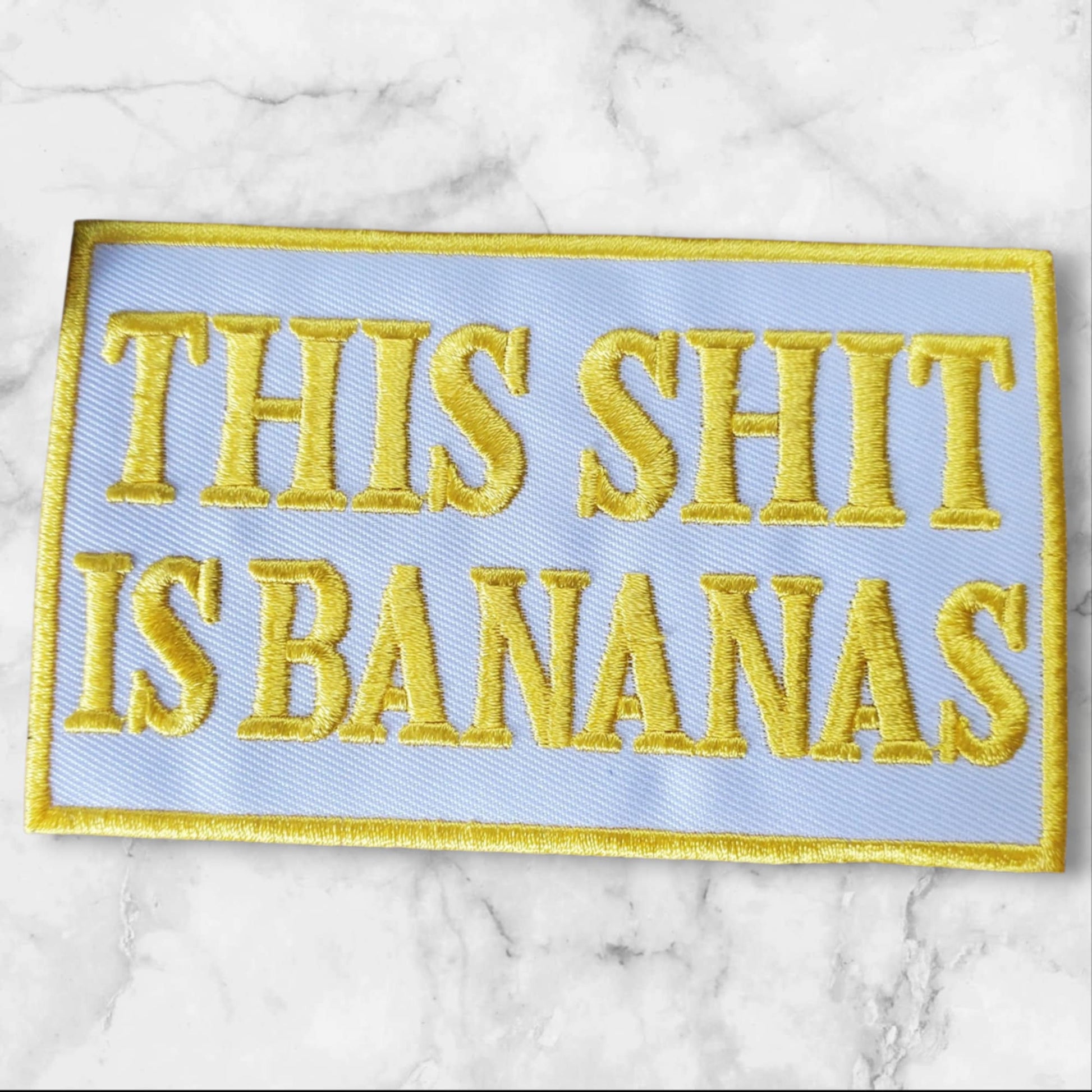 Larger 4-Inch "This Shit Is Bananas" Embroidery Patch - Funny Trucker Hat Patch - White & Yellow Statement Patch